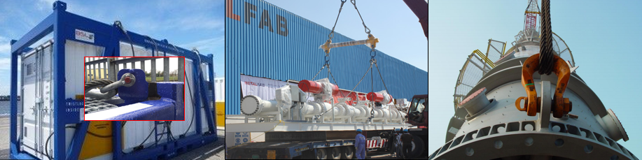 Untuk memudahkan pemahaman terkait wujud atau rupa dari lifting lug, kami kumpulkan sejumlah gambar dari internet terkait dengan lifting lug. Pada gambar pertama (paling kanan) adalah lifting lug yang menempel pada offshore container lengkap dengan shackle dan wire rope sling. Sementara pada gambar kedua (tengah) adalah lifting lug yang merupakan bagian dari spreader bar (warna kuning) serta ada juga yang menempel pada skid package sebuah peralatan (warna putih). Gambar terakhir adalah lifting lug yang menempel pada sebuah bejana tekan (vertical pressure vessel) pada sisi tail yang sedang diberdirikan untuk diposisikan diatas pondasi.