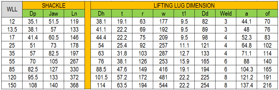 Seperti ungkapan yang kami sampaikan didepan bahwa “dimana ada lifting lug disitu ada shackle”, maka dapat dibuatkan standard desain dari lifting lug berdasarkan ukuran dan kapasitas shackle yang akan menyertainya. Berikut adalah desain standard yang dapat dijadikan sebagai referensi awal untuk medesain lifting lug yang kami kutipkan dari “Rigging Engineering Basic’s by J. Keith Anderson” dengan catatan table ini harus digunakan oleh lifting planner yang qualified. Referensi dari notasi yang digunakan dapat merujuk pada gambar 3 yang terdapat dibawah table.