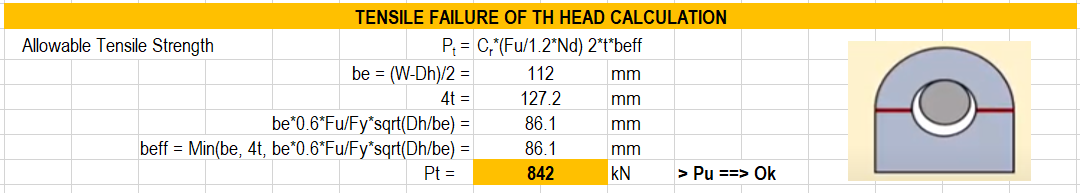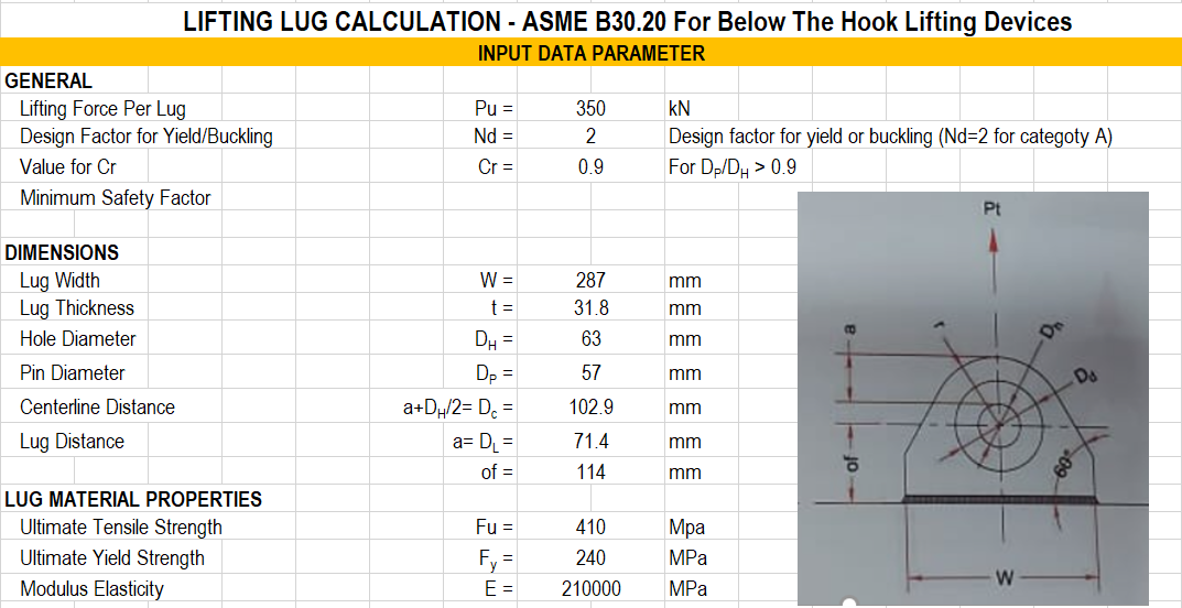 Dengan hand calculation, distribusi tegangan actual tidak dapat dihitung secara akurat sebagaimana perhitungan denga metode elemen hingga (FEM), tetapi dengan memperhitungan sejumlah parameter terkait dengan kemungkinan kegagalan dari lifting lug maka kapasitas dapat ditentukan. Paremeter terkait kapasitas yang dimaksud terdiri dari; tension failure of the head, single plane failure, double plane share failure, pin bearing failure, attaching weld connection failure serta lateral bending failure. Semua model keruntuhan secara jelas dapat dilihat pada gambar yang kami cantumkan pada contoh perhitungan.