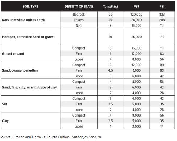 Kalau kita buka sejumlah referensi terkait standard atau guideline lifting operation, jawaban pertanyaan tentang bagaimana menentukan daya dukung ijin tanah adalah lift planners diminta berkonsultasi dengan civil atau geotechnical engineer dan atau untuk kasus kasus operasi pengangkatan rutin bisa mengacu pada table berikut yang dipropose oleh Jay Shapiro, crane and derrick fourth edition.