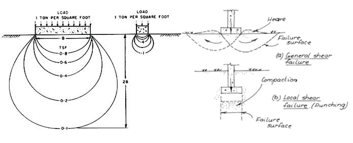 - Apabila lapisan tanah menerima beban berlebih maka, masa tanah tersebut akan mengalami kegagalan. Secara umum, model kegagalan tanah ada dua; pertama adalah general share failure sebagaimana ditunjukan pada gambar kanan atas serta kegagalan local shear (punching) yang ditunjukan oleh gambar kiri bawah. Pada kasus general share failure, ditandahi dengan heave (masa tanah mumbul) pada kanan kiri mat/pondasi yang disertai dengan penurunan. Sementara pada local shear failure (punching), hanya ditandai dengan penurunan berlebih pada mat/pondasi tanpa terjadi heave.